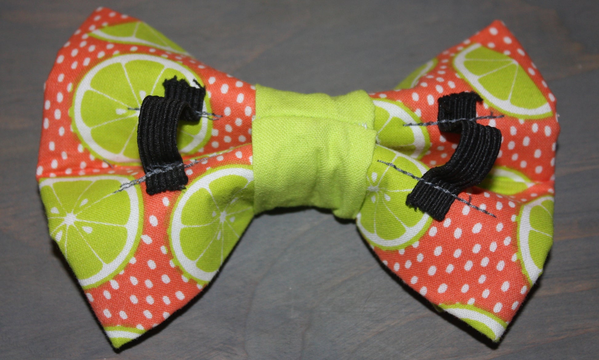 Handmade bow tie with durable elastic loops to keep it in place. Our bow ties slide onto any removable collar (up to one inch wide) to help keep your pet looking posh!