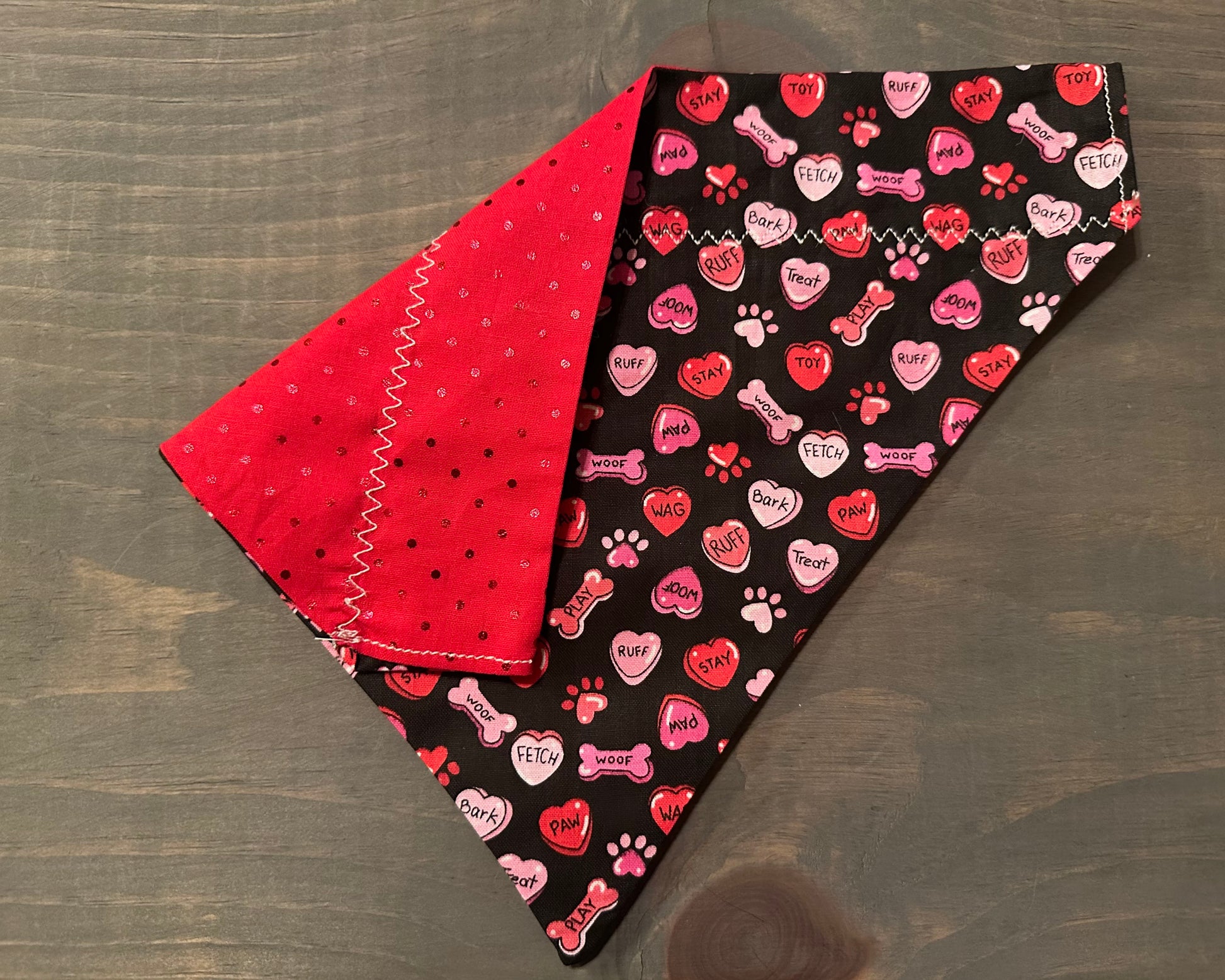 Spread some love with our reversible Canine Conversation Candy Hearts Over the Collar Bandana featuring your furriend's favorite words in candy conversation hearts on a black background. The reverse side is a solid read print with red foil polka dots. This bandana is perfect for your sweet and furry Valentine. #valentines #cuteandclassy #dogaccessories