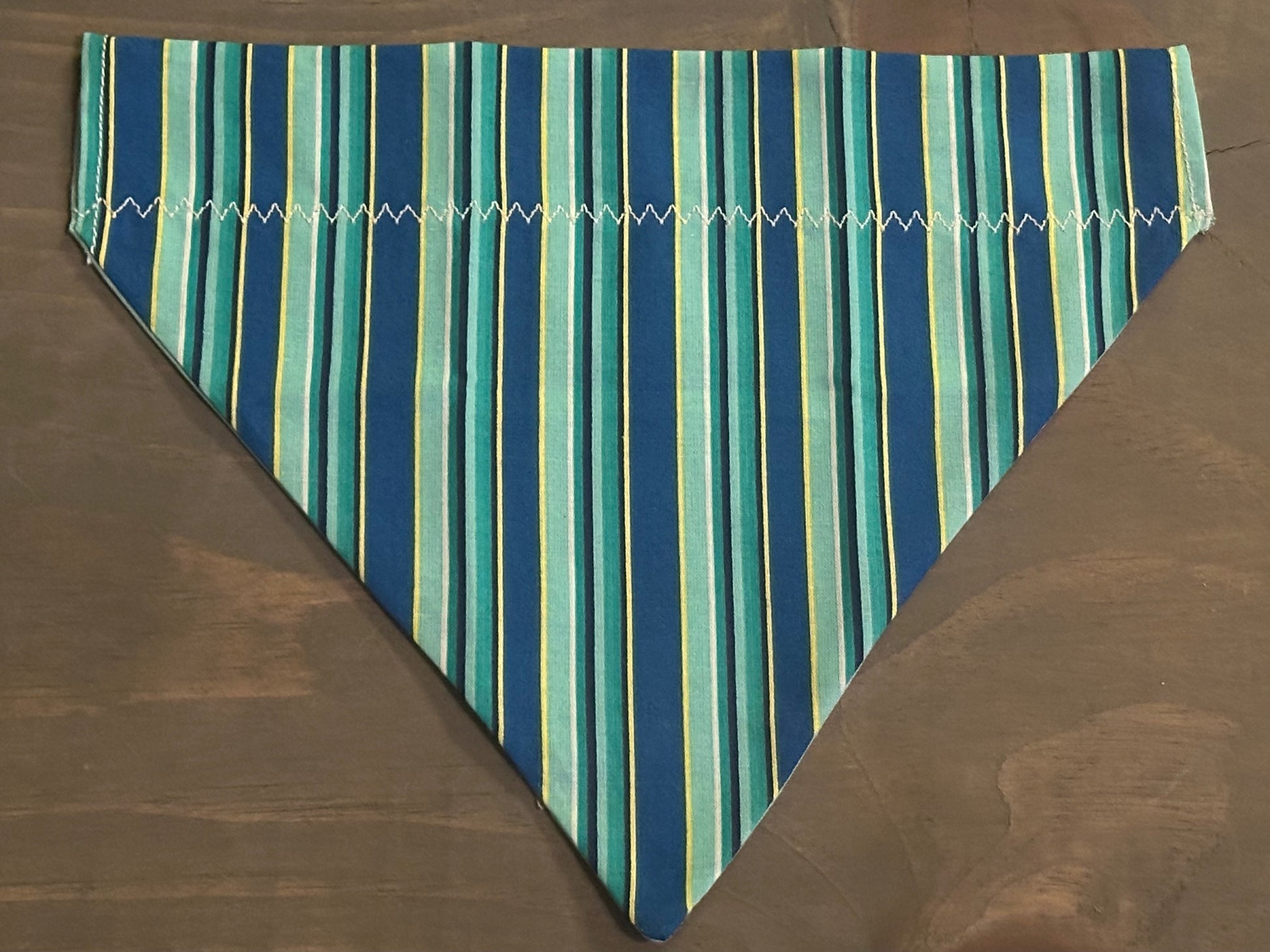 Get ready to be the coolest cat (or dog) on the block with our Cool Stripes Over the Collar Bandana! Featuring a fun mix of blue, aqua, and yellow stripes on the front and a light aqua solid on the back, this pet reversible bandana will add a pop of color and personality to your furriend.