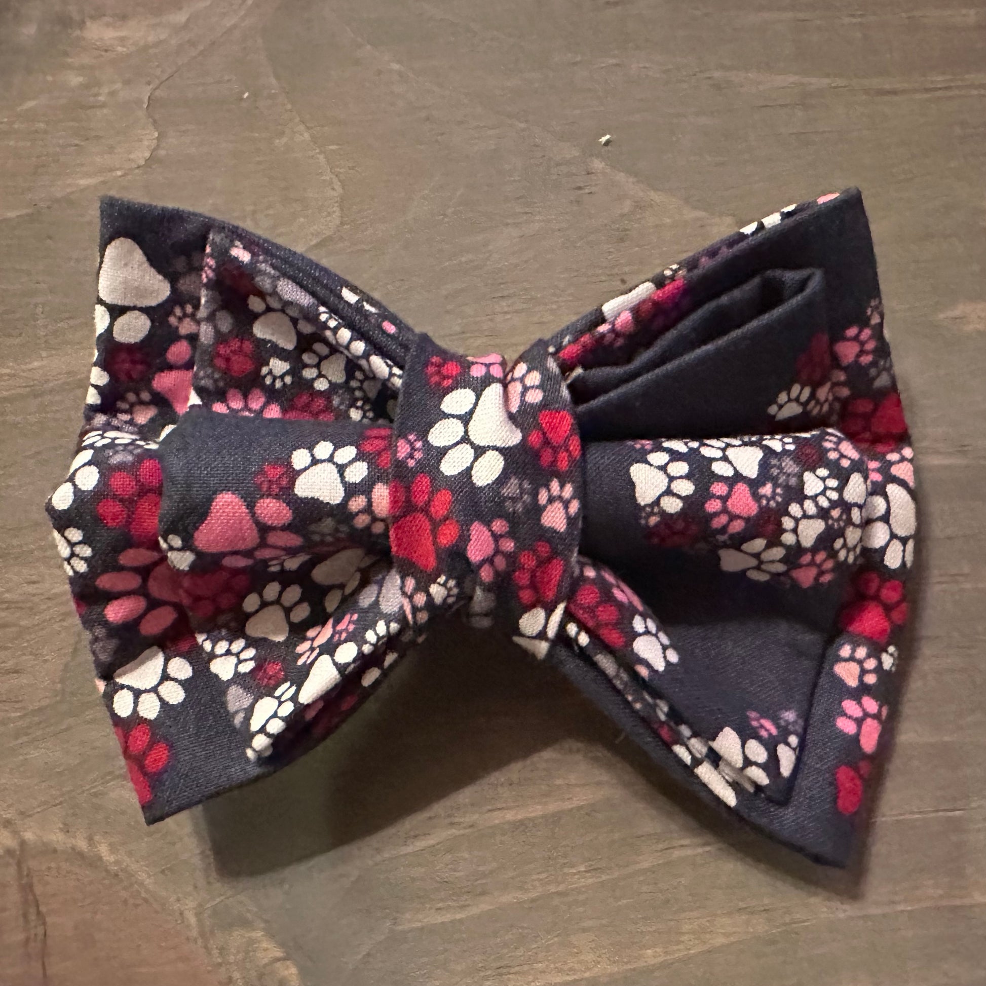 A fashionable pet isn't complete without this charming Hearts of Paws Bow Tie! Featuring a navy backdrop with multicolored hearts of paws in various sizes, this accessory adds a playful touch to any pet's wardrobe.