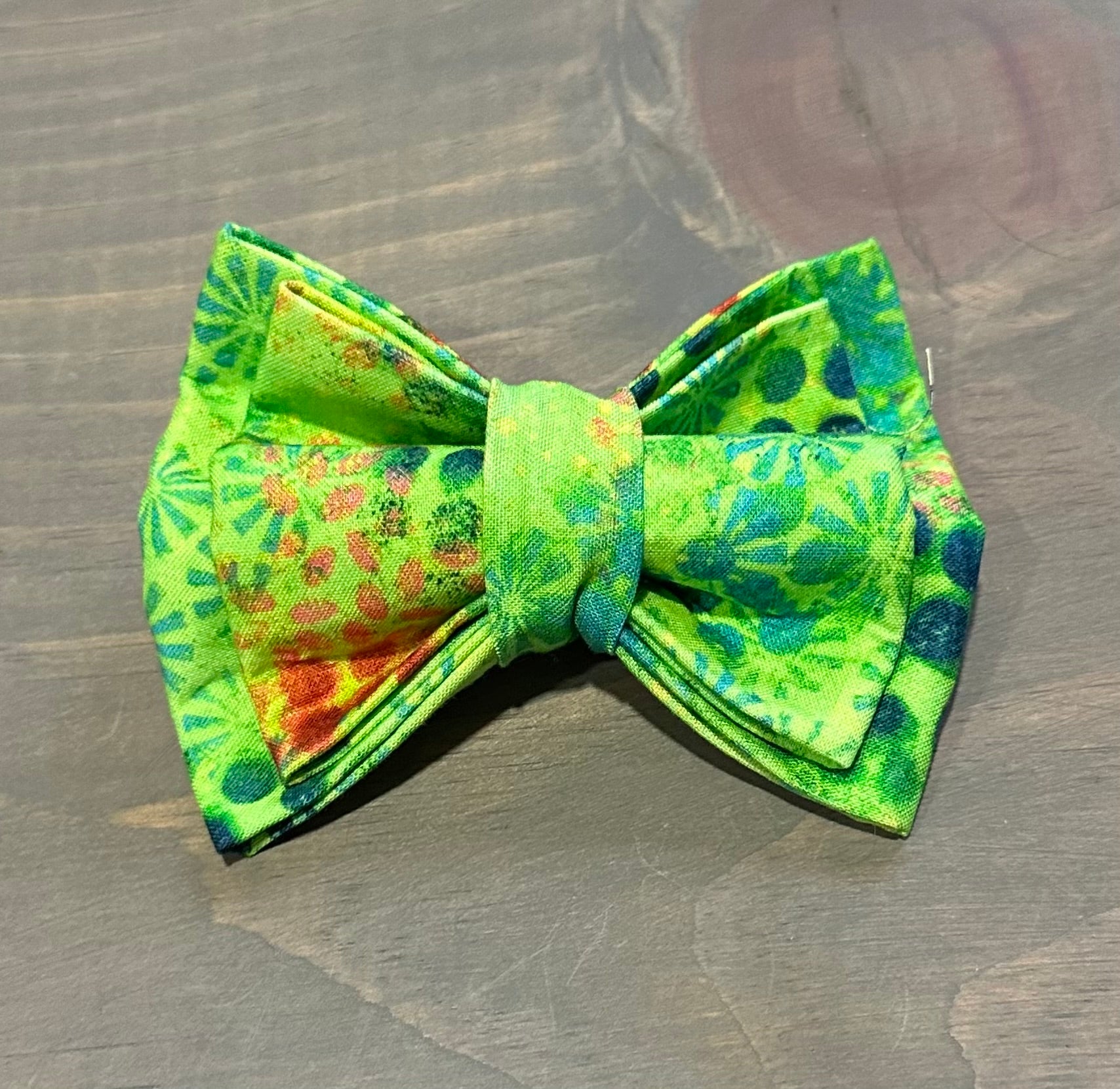 Get your furry friend noticed with our Funky Stencil Bow Tie! This pet bow tie features a playful lime background and a multicolored stencil pattern that is sure to make a statement. Your pet will stand out from the pack with this unique accessory!