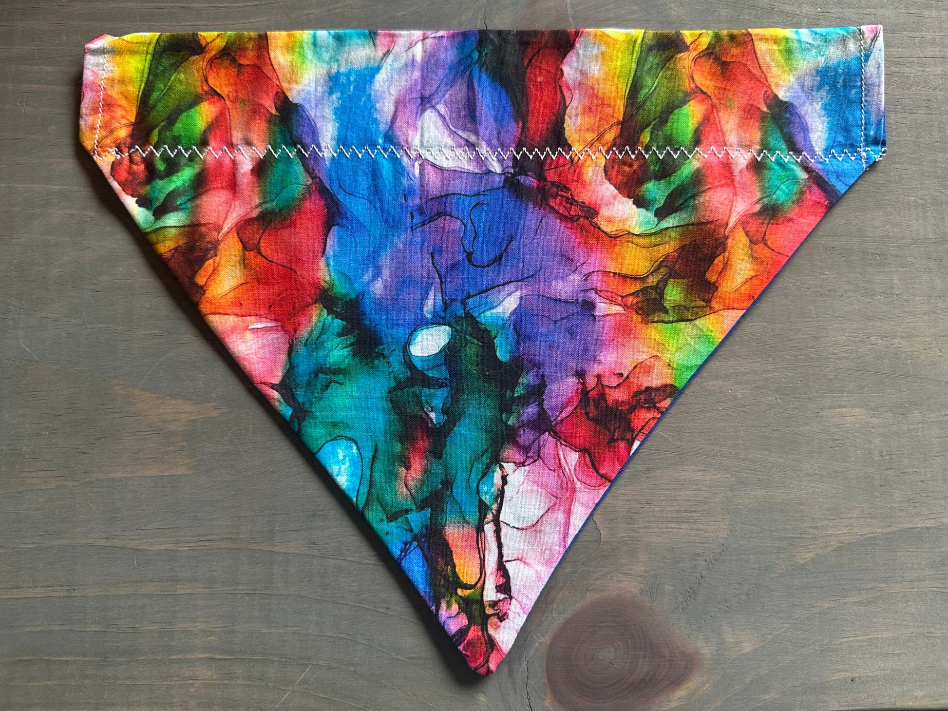 Add a playful pop of color with our Rainbow Slick Over the Collar Bandana. Perfect for your furry friend, this unique bandana features eye-catching multicolored slick pattern in bright blue, bold green, perfect purple, and vibrant yellow on the front and a royal blue solid on the back. Let your imagination run wild with this one-of-a-kind reversible bandana.
